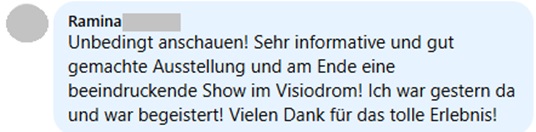 Nachfolgend zeigen wir Auszüge von Kommentaren und Empfehlungen aus Facebook, Instagram, Google sowie Tripadvisor. Aus Gründen des Datenschutzes sind die Nachnamen und Profilbilder unkenntlich gemacht worden.